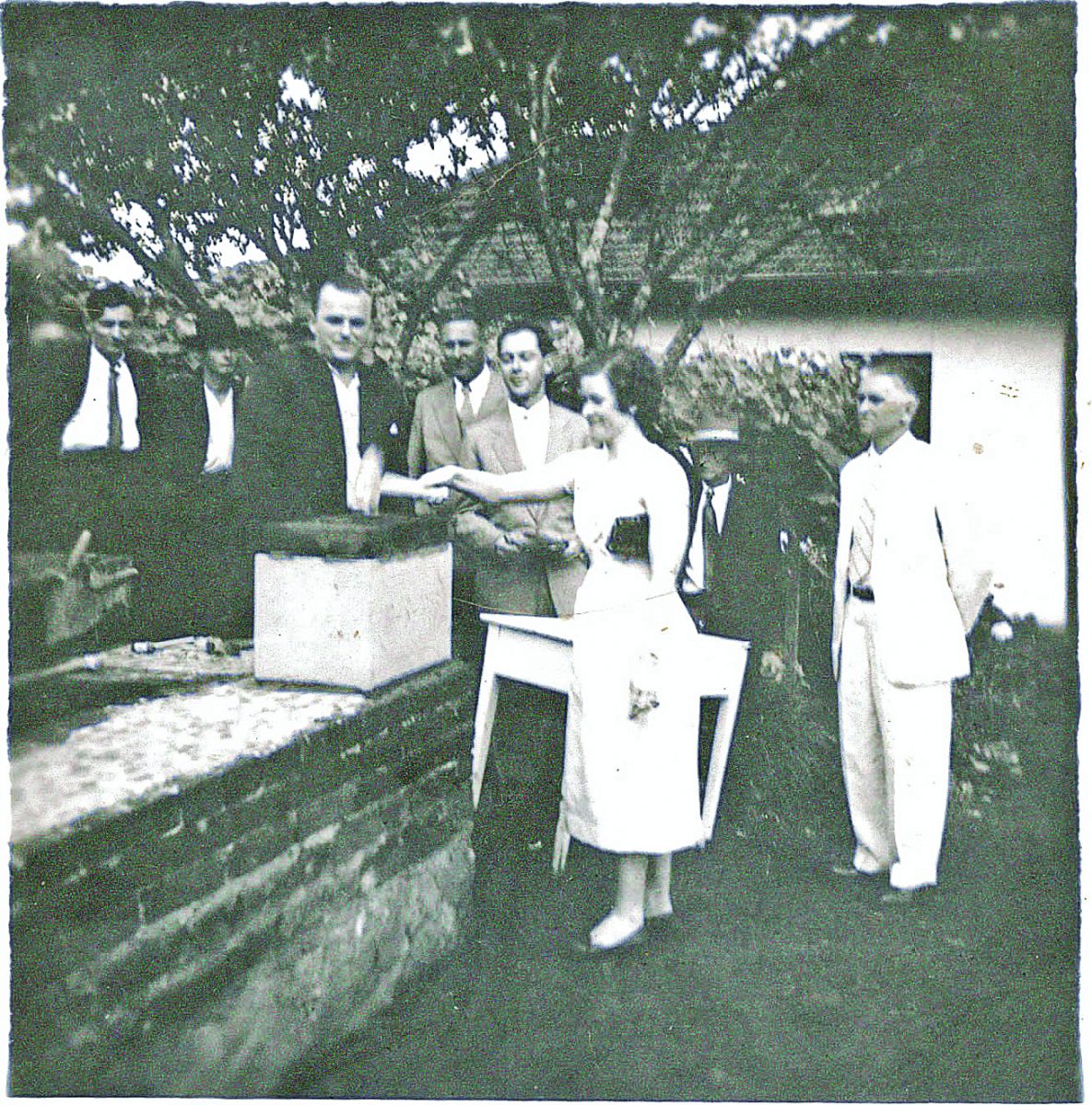 Lançamento da pedra fundamental da então subprefeitura de Languiru, no começo da década de 1960. Elton Klepker e Erna Schneider Lagemann foram algumas das lideranças que participaram do ato. Foto: Divulgação