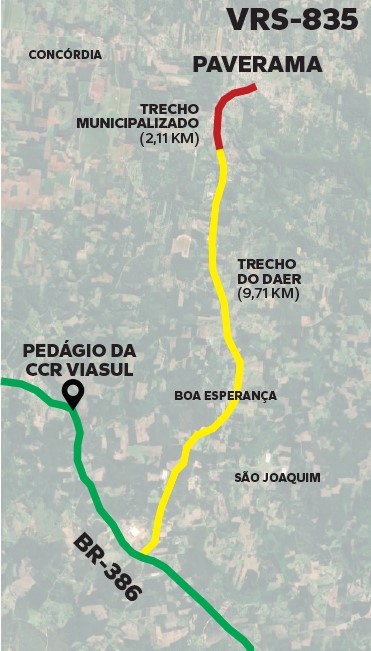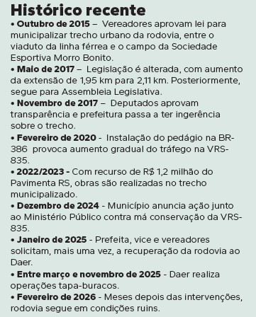 A situação se agravou a partir da instalação do pedágio da CCR Via Sul na BR-386, em fevereiro de 2020, a cinco quilômetros do entroncamento com a VRS-835. Muitos motoristas que seguem em direção a Teutônia, por exemplo, preferem cortar caminho para não terem de pagar a tarifa mínima de R$ 5,50.