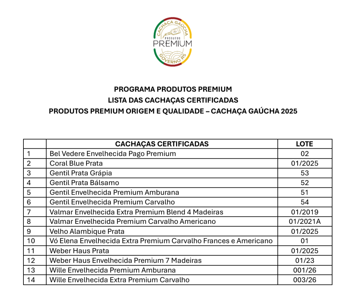 Mesmo as cachaças não certificadas seguem aptas para consumo, mas o selo exige padrões superiores. Para a Cachaçaria Wille, a conquista consolida Poço das Antas no mapa da produção premium de cachaça no Rio Grande do Sul e fortalece a presença da marca no cenário estadual. Veja a lista abaixo.