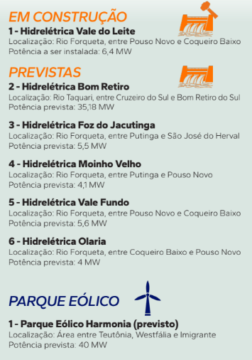 Ainda para o eixo do Forqueta, mais futuramente, a cooperativa mantém os planos da Moinho Velho, com 4,1 MW, entre Putinga e Pouso Novo; da Vale Fundo, com 5,6 MW, entre Pouso Novo e Coqueiro Baixo; e da Olaria, com 4 MW, entre Coqueiro Baixo e Pouso Novo.
