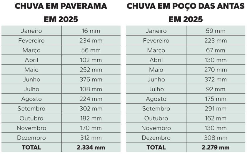 Jantsch faz o registro dos índices há cerca de 15 anos. Ele aponta que no ano de 2025 foram medidos, no pluviômetro instalado em sua casa, 2.334 milímetros de chuva. Esse montante foi menor do que no ano de 2025, que teve 2.802 mm no total, sendo que a diferença ficou em 468 mm. Janeiro foi o mês menos chuvoso, com apenas 16 mm, enquanto junho foi o com maior precipitação pluviométrica, somando 376 mm.