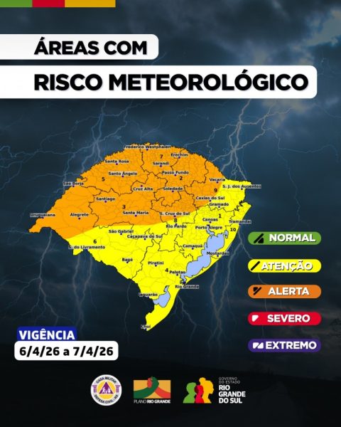 Na tarde e noite desta segunda-feira, 6, há condição para tempestades acompanhadas de rajadas de vento que podem superar os 90 km/h, chuva pontualmente forte e queda de granizo isolado nas regiões Oeste, Missões, Noroeste, Norte, Centro, Campanha e partes do Sul, Vales, Serra e Região Metropolitana de Porto Alegre (RMPoa). O risco de rajadas de vento intensas e chuva forte é maior a partir da noite, quando tempestades avançam pela região Oeste em direção ao Centro. Os acumulados oscilam entre 10 e 50 mm/dia, chegando pontualmente até 90 mm/dia no Oeste, Centro e Campanha.