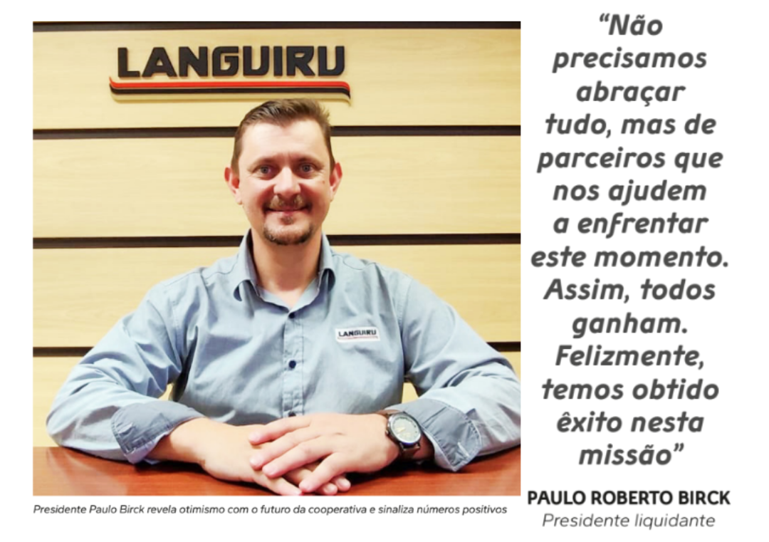 Presidente liquidante desde 2023, Paulo Roberto Birck sublinha que a Languiru “sempre soube vencer” as dificuldades, por vezes simbolizado pelo fôlego de uma nova gestão. Nesse sentido, destaca que foi necessário enxugar a estrutura, renegociar dívidas, concentrar as operações em quatro pilares (Agrocenter, Laticínios, Frigorífico de Aves e Fábrica de Rações) e buscar apoios. “Não precisamos abraçar tudo, mas de parceiros que nos ajudem a enfrentar este momento. Assim, todos ganham. Felizmente, temos obtido êxito nesta missão”, avalia Birck.
