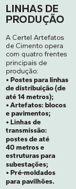 Atualmente, a Certel Artefatos de Cimento opera com quatro frentes principais de produção: postes para linhas de distribuição (de até 14 metros); artefatos (blocos e pavimentos); linhas de transmissão (postes de até 40 metros e estruturas para subestações); e pré-moldados para pavilhões.