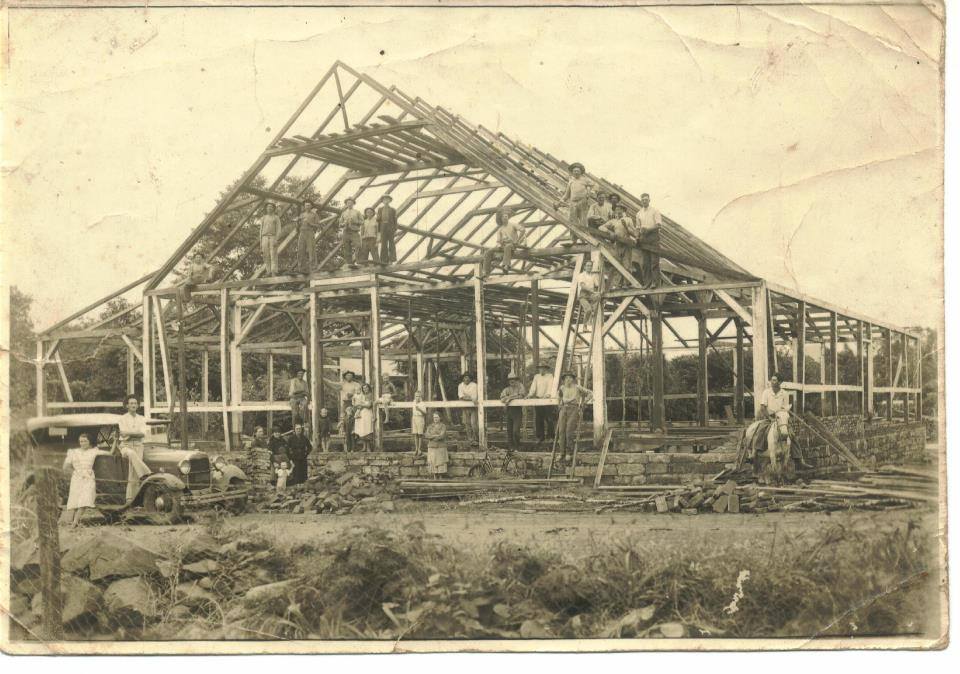 Emílio Graeff e a esposa Georgina junto ao Ford, e operários que ergueram o prédio em 1935. Construção possui versões distintas. Foto: Acervo Selby Wallauer