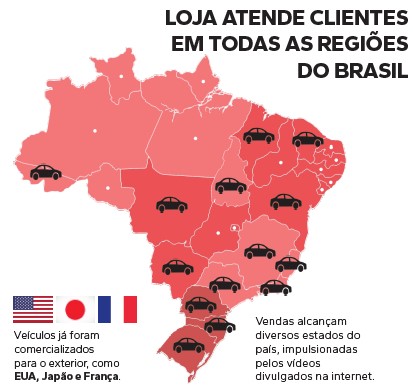 A lista de destinos impressiona: Maranhão, Pará, Acre, Bahia, Ceará, Espírito Santo, Rio de Janeiro, São Paulo, Minas Gerais, Mato Grosso, Paraná, Santa Catarina e Tocantins estão entre os estados que já receberam veículos comercializados pela empresa. Fora do país, negócios foram concretizados em cidades como Boston, Miami e Nova York, além de países como Japão e França.