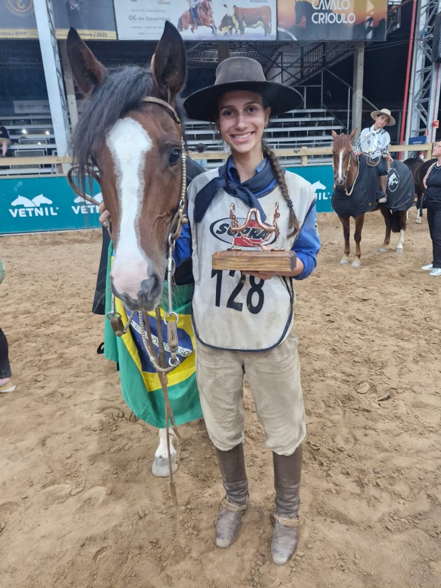 O Centro de Doma e Treinamento (CDT) Oberte Cunha, de Fazenda Vilanova, celebrou um resultado histórico no Freio Jovem 2025, realizado entre os dias 12 e 15 de novembro, no Parque Assis Brasil, em Esteio. A conquista do Freio de Bronze veio com a ginete Anita Budnieski Cunha, 17 anos, montada na égua La Eternidad Cristal. Ela garantiu o terceiro lugar na categoria Juvenil Feminino B, em uma das principais competições equestres do RS.