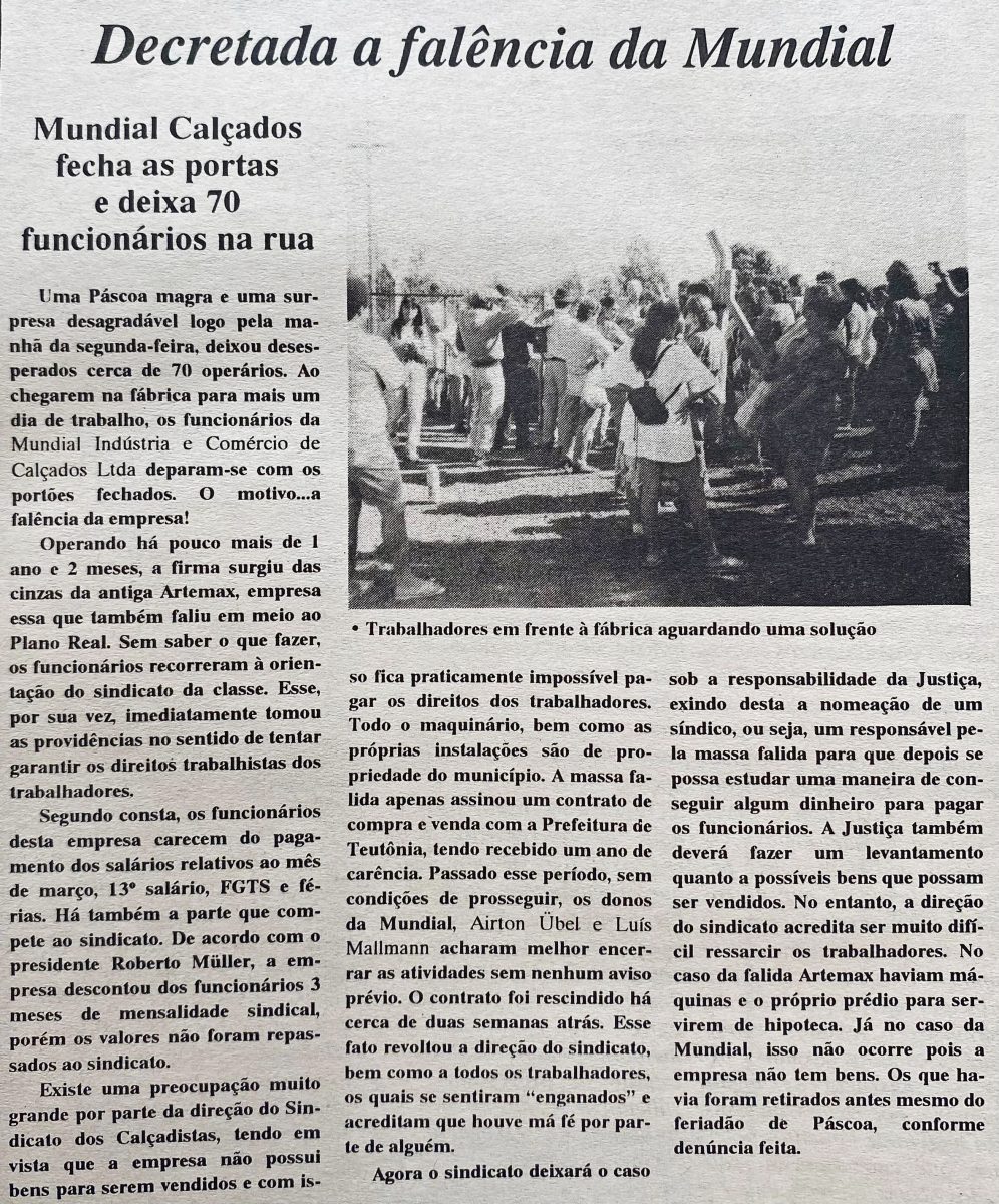 A Mundial Indústria e Comércio de Calçados Ltda encerrava suas atividades após a decretação de falência, deixando cerca de 70 funcionários desempregados. A empresa, que surgiu da antiga Artemax, também falida em meio ao Plano Real, não possuía bens para quitar as dívidas trabalhistas, já que parte do patrimônio teria sido retirada. O sindicato da categoria buscava garantir os direitos dos trabalhadores, que se diziam “enganados” e suspeitavam de má-fé na condução do processo.