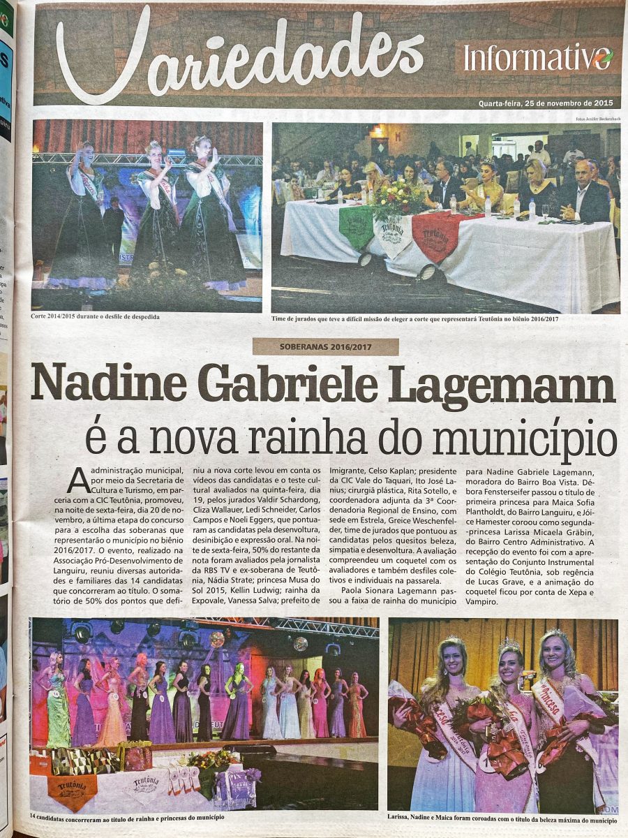 Nadine Gabriele Lagemann era eleita rainha de Teutônia para o biênio 2016/2017, tendo destaque entre as 14 candidatas que disputaram o título. Completando a corte, Maica Sofia Plantholdt assumia o posto de primeira princesa e Larissa Micaela Gräbin era coroada segunda princesa.