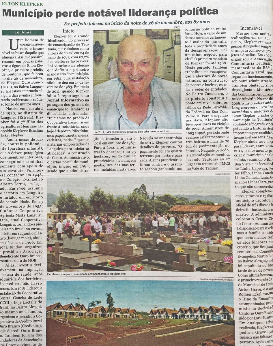 Falecia, aos 87 anos, Elton Klepker, o primeiro prefeito de Teutônia. Ele foi um dos idealizadores do processo de emancipação e o responsável pela construção do Centro Administrativo, inaugurado em 1984. Em 1955, Klepker integrou o grupo de fundadores da Cooperativa Agrícola Mista Languiru; em 1971, esteve à frente da Associação Beneficente Ouro Branco; e, em 1981, da Cooperativa de Crédito Rural Ouro Branco (Crediouro). Também foi ainda um dos fundadores da Associação Pró-Desenvolvimento de Languiru (APDL).