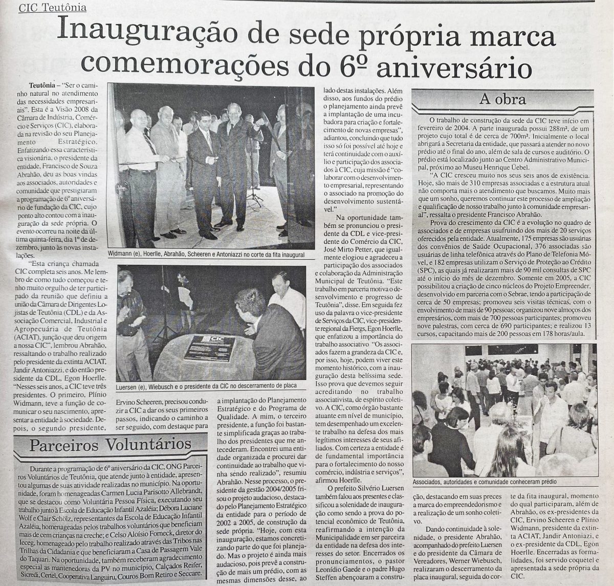 A CIC Teutônia celebrava seu 6º aniversário inaugurando a sua sede própria. A entidade nasceu da união entre a Câmara de Dirigentes Lojistas de Teutônia (CDL) e a Associação Comercial, Industrial e Agropecuária de Teutônia (ACIAT). As obras da nova sede haviam iniciado em fevereiro de 2004. Na época da inauguração, a CIC já reunia cerca de 310 empresas associadas.