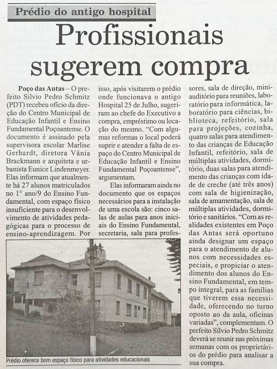 O prédio do antigo Hospital 25 de Julho, em Poço das Antas, era apontado por profissionais como uma alternativa para suprir a falta de espaço do Centro Municipal de Educação Infantil e Ensino Fundamental Poçoantense, com a sugestão de aquisição do imóvel pelo poder público. A proposta se concretizou ao longo dos anos e, atualmente, a instituição de ensino ocupa parte da estrutura.