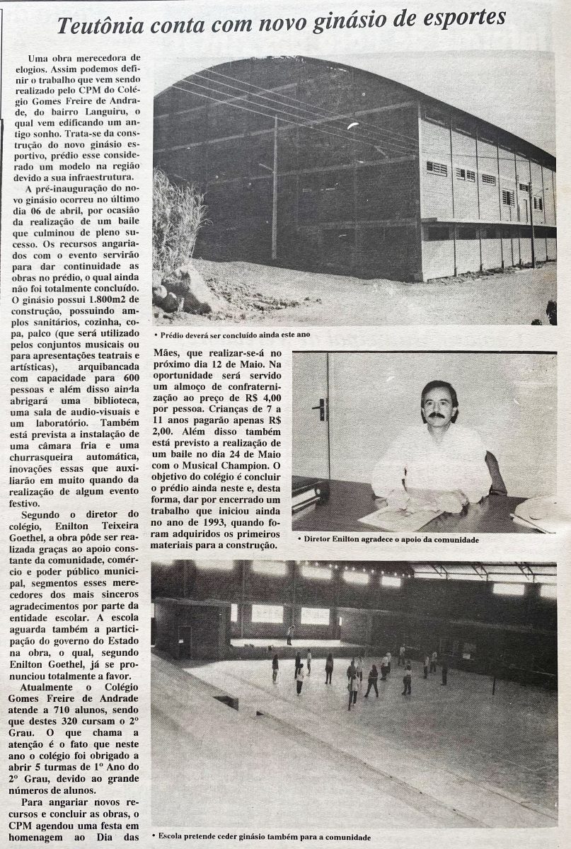 Teutônia tinha em andamento a construção do ginásio de esportes na Escola Gomes Freire de Andrade, em Languiru. Com 1.800 m², a obra era conduzida pelo CPM e ainda aguardava a participação do governo estadual para sua conclusão. Na época, o colégio atendia 710 alunos e a expectativa era finalizar o ginásio, iniciado em 1993, ainda naquele ano.