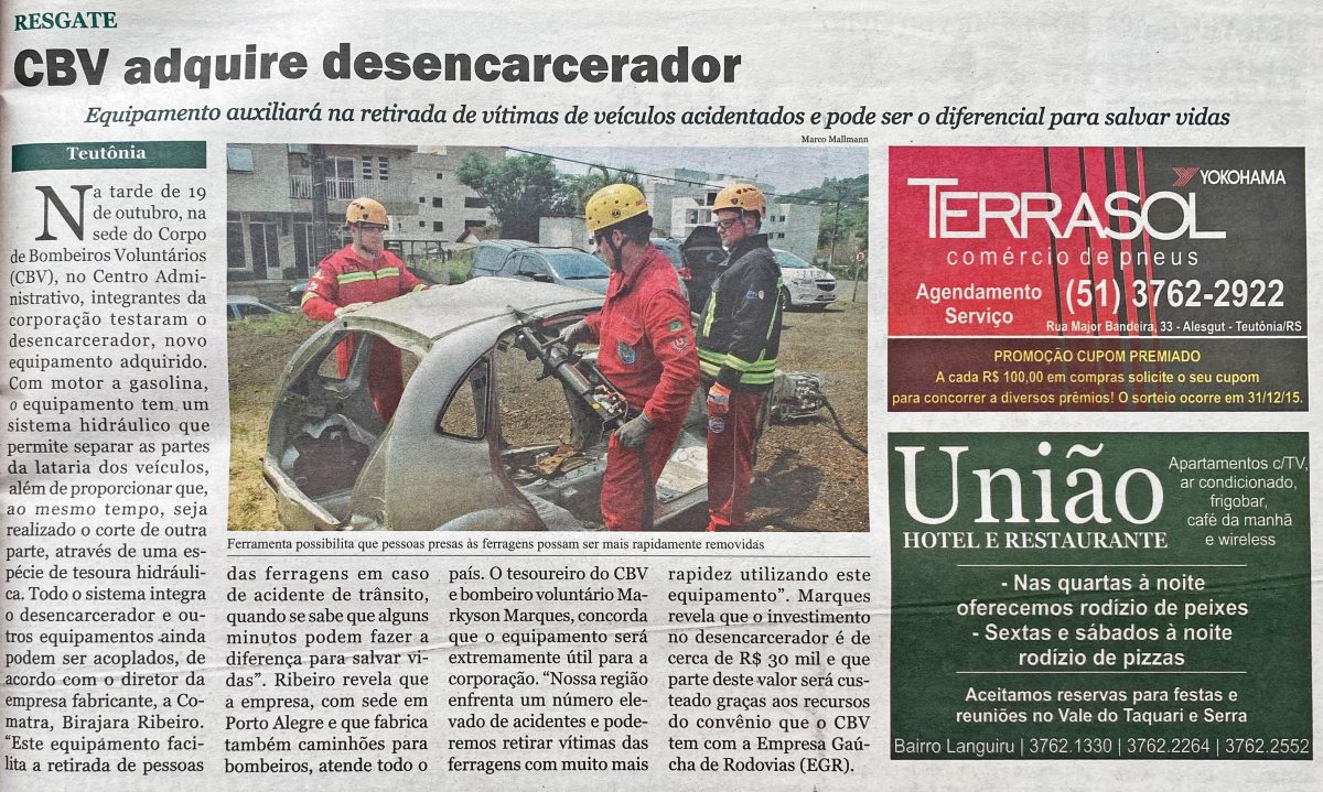 O Corpo de Bombeiros Voluntários de Teutônia adquiria um desencarcerador, equipamento para o resgate de vítimas presas em ferragens após acidentes de trânsito. O investimento de R$ 30 mil foi viabilizado por meio de um convênio entre o CBV e a Empresa Gaúcha de Rodovias (EGR).