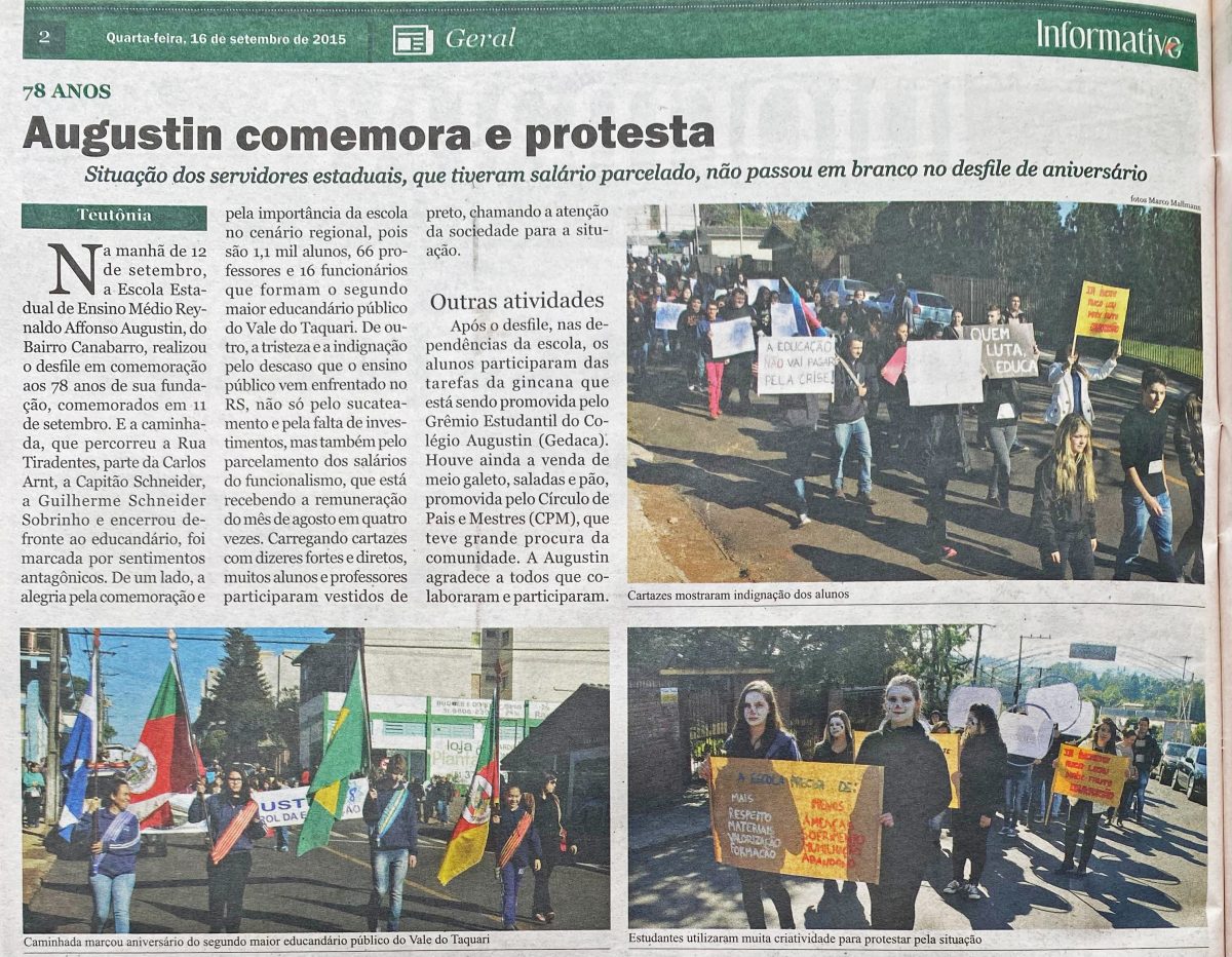 A Escola Estadual de Ensino Médio Reynaldo Affonso Augustin, de Canabarro, celebrava seu 78º aniversário em desfile comemorativo e manifestação. Durante a passeata, professores, funcionários e estudantes protestaram contra o parcelamento dos salários dos servidores estaduais. Naquele período, o educandário era o segundo maior do Vale do Taquari, reunindo cerca de 1,1 mil alunos, 66 professores e 16 funcionários.