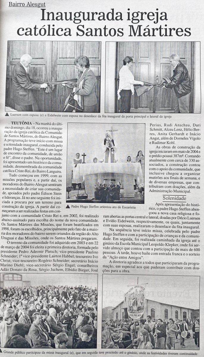 Era inaugurada a Igreja Católica Santos Mártires, no Bairro Alesgut, em Teutônia. A comunidade se formou a partir do desmembramento da Paróquia Cristo Rei, de Languiru. O nome escolhido homenageia os Santos Mártires das Missões, beatificados em 1998, refletindo a origem da maioria dos moradores, vindos do Alto Uruguai e da região das Missões. As obras da Igreja, com 387 metros quadrados, haviam começado em maio de 2004.