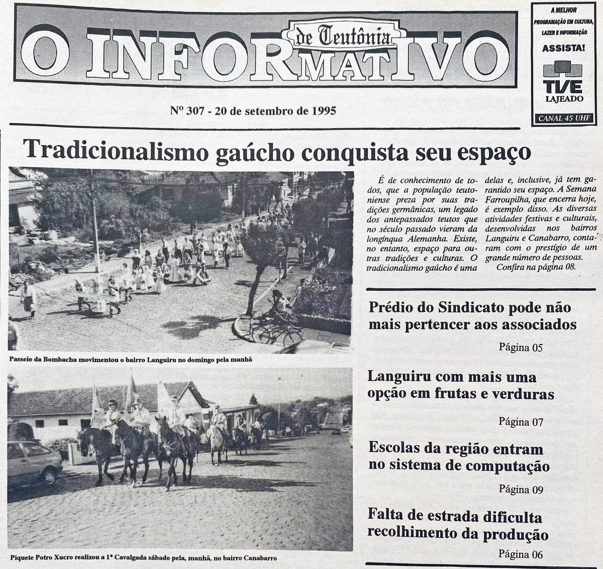 Desfiles encerravam a Semana Farroupilha em Teutônia. No Bairro Canabarro, acontecia a primeira Cavalgada, organizada pelo CTG Porteira dos Pampas em parceria com o Piquete Potro Xucro. Em Languiru, o CTG Rincão das Coxilhas promovia o já tradicional Passeio da Bombacha, evento que segue sendo realizado até hoje.