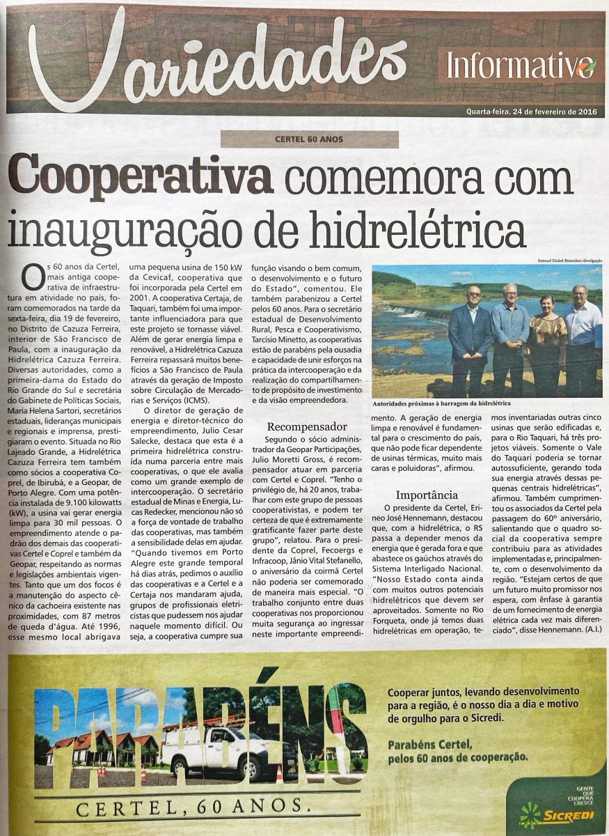 A Cooperativa Certel comemorava seus 60 anos com a inauguração da Hidrelétrica Cazuza Ferreira, em São Francisco de Paula, situada no Rio Lajeado Grande. A obra tinha como sócios a cooperativa Coprel, de Ibirubá, e a Geopar, de Porto Alegre.