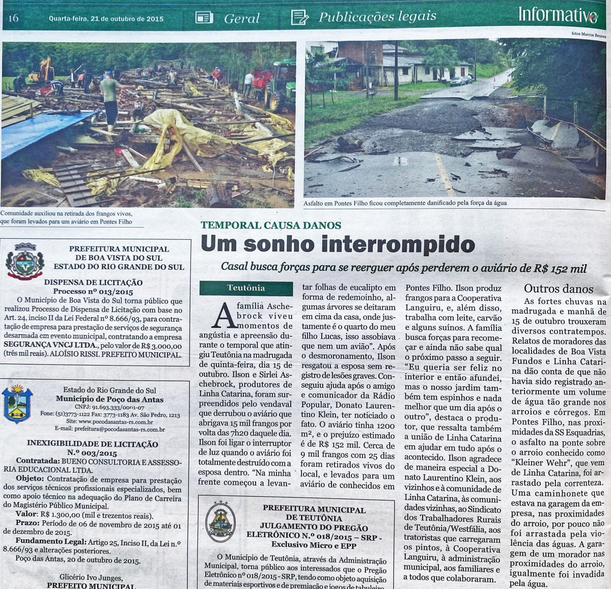 Forte temporal atingia Teutônia e deixava rastro de destruição e prejuízos. Na Linha Catarina, a propriedade da Família Aschebrok foi uma das mais afetadas. O vento derrubou o aviário que abrigava 15 mil frangos, avaliado em R$ 152 mil na época. O temporal provocou alagamentos, quedas de árvores e danos em lavouras de outras localidades. Moradores relatavam que nunca antes havia sido registrado um volume de chuva tão grande na região.