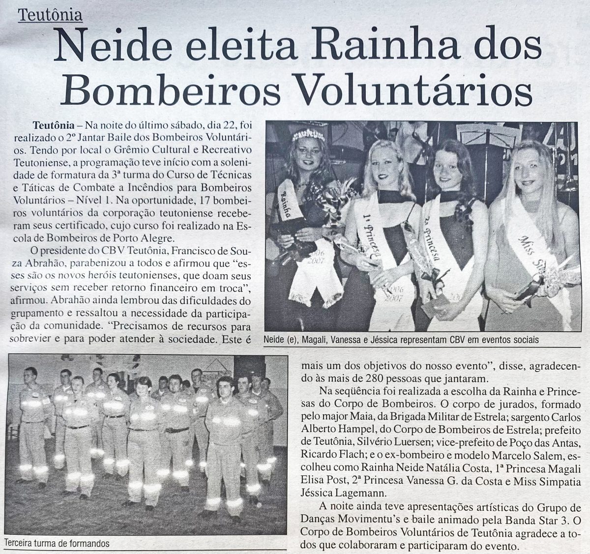O Corpo de Bombeiros Voluntários de Teutônia realizava o 2º Jantar Baile da corporação. Durante a festa, ocorria também a escolha da corte dos Bombeiros Voluntários. Neide Natália Costa foi coroada rainha, Magali Elisa Post recebeu o título de 1ª princesa, e Vanessa da Costa foi eleita 2ª princesa. A faixa de miss simpatia ficou com Jéssica Lagemann.