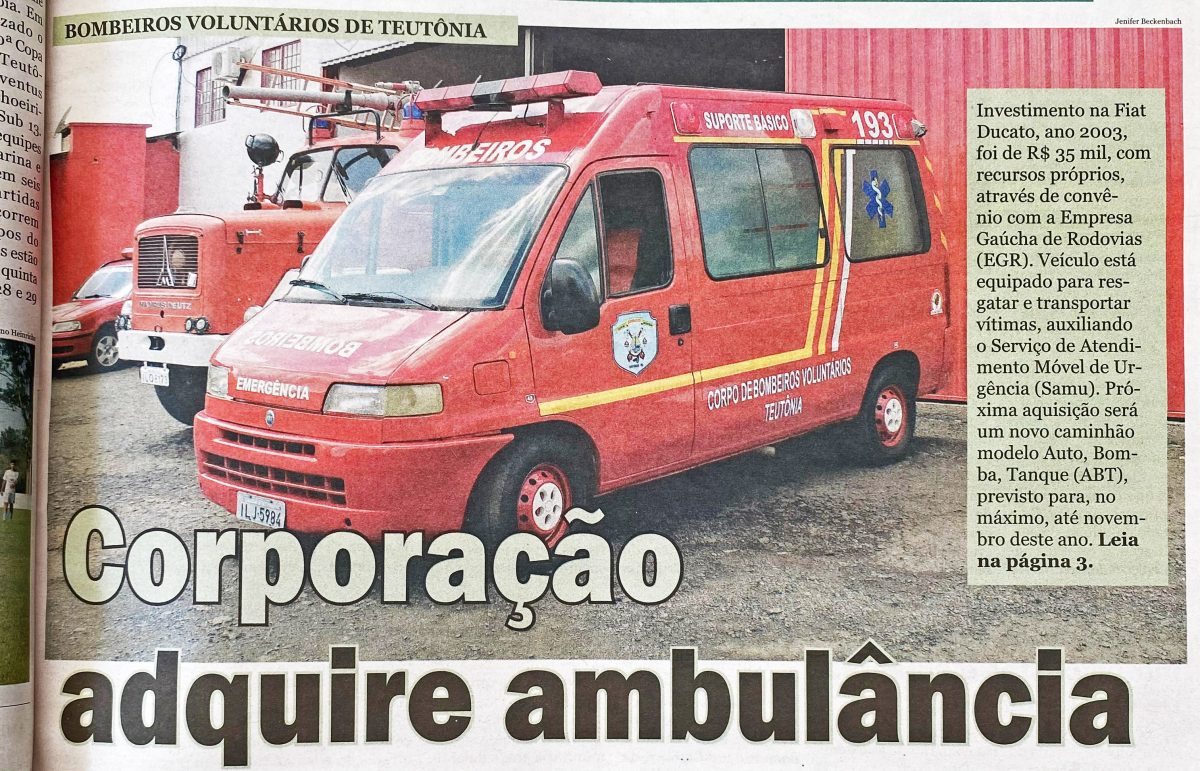 Os Bombeiros Voluntários de Teutônia adquiriam uma ambulância Fiat Ducato 2003, equipada para resgate e transporte de vítimas. O investimento de R$ 35 mil foi feito com recursos próprios e convênio com a EGR. A próxima meta era a compra de um caminhão Auto Bomba Tanque (ABT).