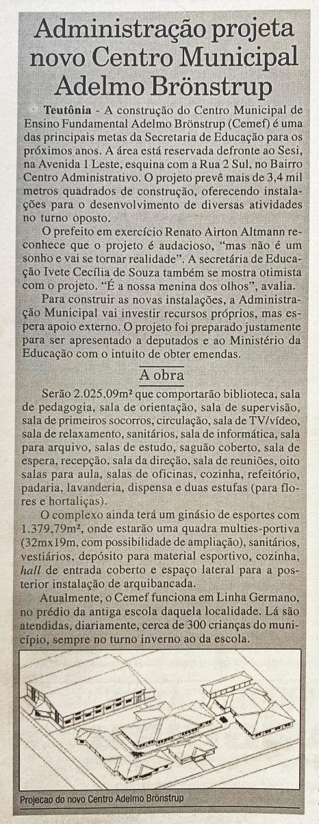 A administração de Teutônia projetava a construção do Centro Municipal de Ensino Fundamental Adelmo Brönstrup (Cemef), uma das principais metas da Secretaria de Educação na época. O projeto previa mais de 3,4 mil metros quadrados de área construída, no local onde hoje está o Cemef Leonel de Moura Brizola. Anteriormente, o Cemef funcionava no prédio da antiga escola de Linha Germano.