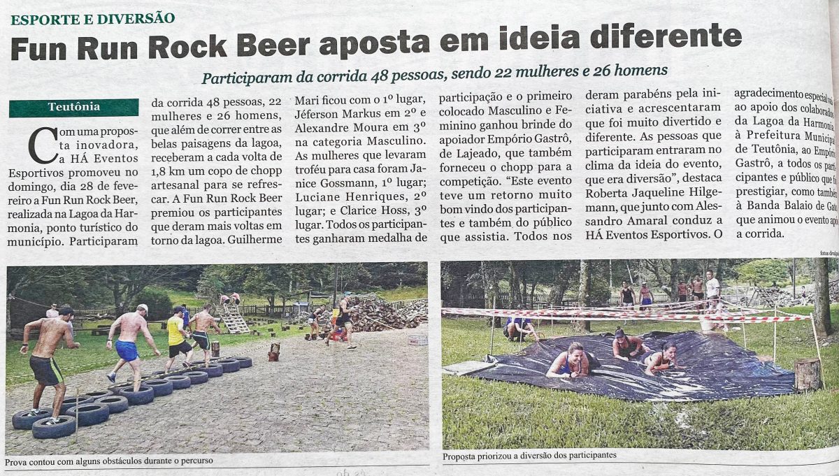 A Lagoa da Harmonia, em Teutônia, sediava a Fun Run Rock Beer, promovida pela HÁ Eventos Esportivos, que reuniu participantes em uma corrida em torno da lagoa, com premiação para quem completasse mais voltas. A cada volta, os inscritos recebiam um copo de chope artesanal.