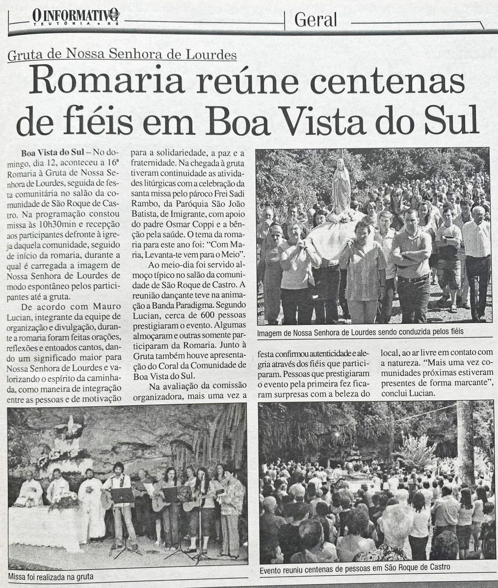 A 16ª Romaria à Gruta de Nossa Senhora de Lourdes, em Boa Vista do Sul, reunia cerca de 600 fiéis, com celebração da missa conduzida por Frei Sadi Rambo, da Paróquia São João Batista de Imigrante, e pelo padre Osmar Coppi.