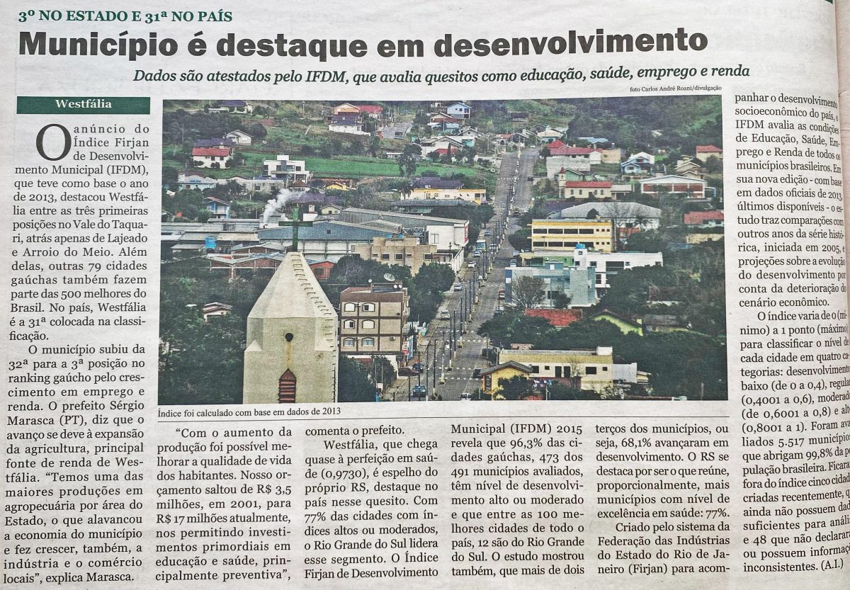 Há 10 anos: Westfália alcançava o 3° lugar em desenvolvimento municipal no Vale