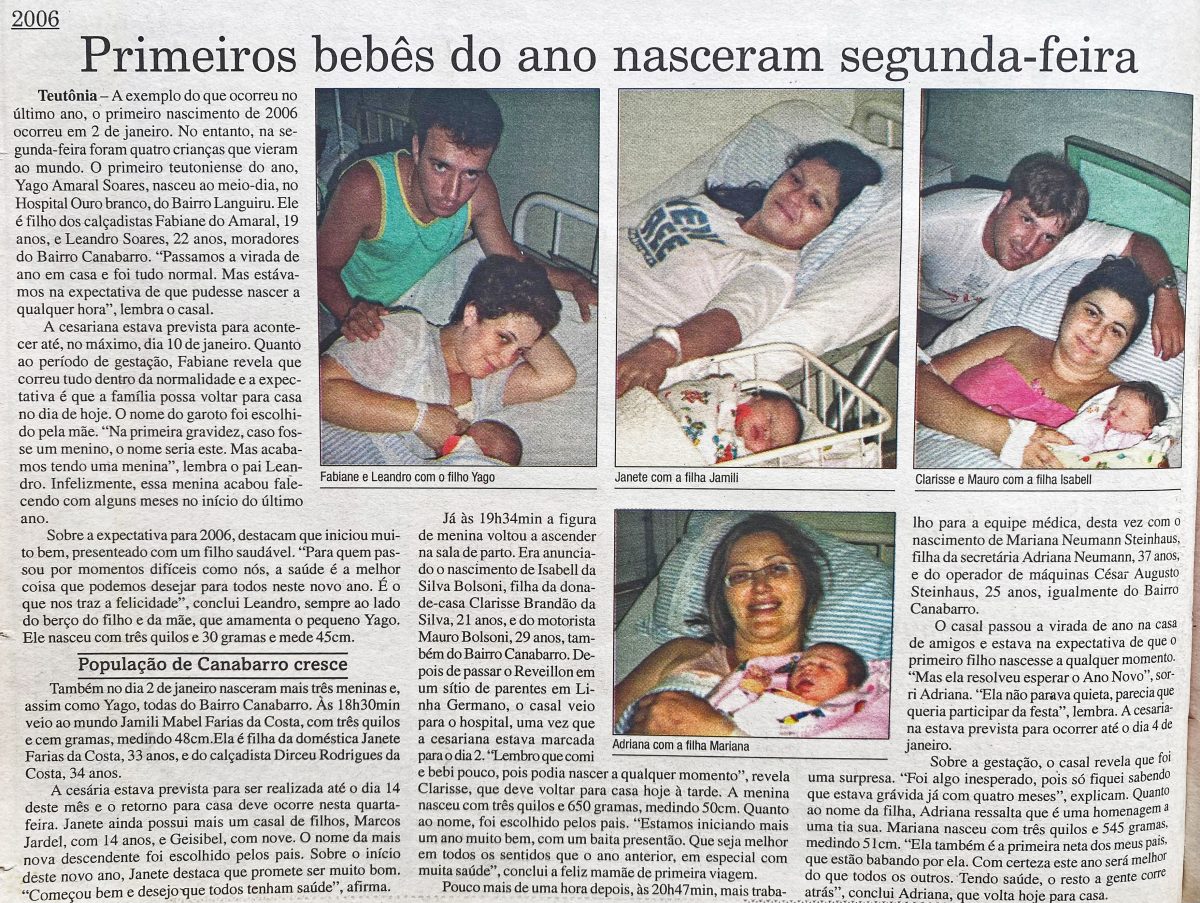 Os primeiros bebês do ano nasceram em uma segunda-feira, dia 2 de janeiro. O primeiro teutoniense de 2006 foi Yago Amaral Soares. No mesmo dia, nasceram mais três meninas, todas do Bairro Canabarro: Jamili Mabel F. da Costa, Isabell da Silva Bolsoni e Mariana Neumann Steinhaus.