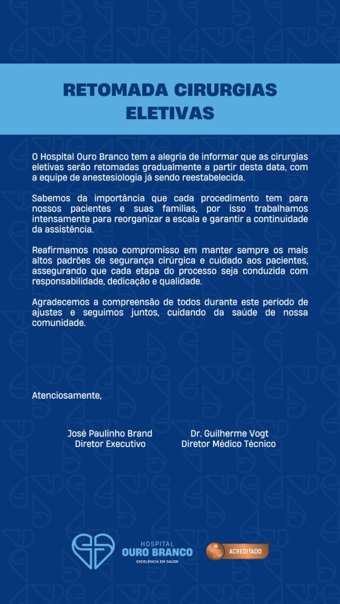 O Hospital Ouro Branco informou, nesta quinta-feira, 2, que as cirurgias eletivas serão retomadas gradualmente a partir desta data, com p restabelecimento da equipe de anestesiologistas.