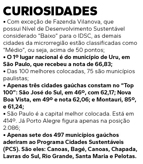 Boa Vista do Sul (1,88), Paverama (0,93) e Westfália (0,87) seguem na mesma linha de alta. Além dos itens mencionados anteriormente, esses municípios demonstraram força nos objetivos “Cidades e Comunidades Sustentáveis” e “Produção e Consumo Sustentáveis”, que abrangem temas como tempo de deslocamento entre casa e trabalho, mortes no trânsito, coleta de resíduos sólidos domiciliares e qualidade de vida.