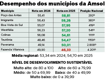 Na sequência, tanto local quanto regional, aparece Imigrante. O município está no 383º lugar brasileiro e em terceiro no Vale. A alta chegou a 1,85 ponto no último ano, impulsionada nos critérios semelhantes aos de Poço das Antas. No entanto, a principal diferença entre as duas é que a cidade recebeu a avaliação “muito alta” apenas no objetivo “Energias Renováveis”.