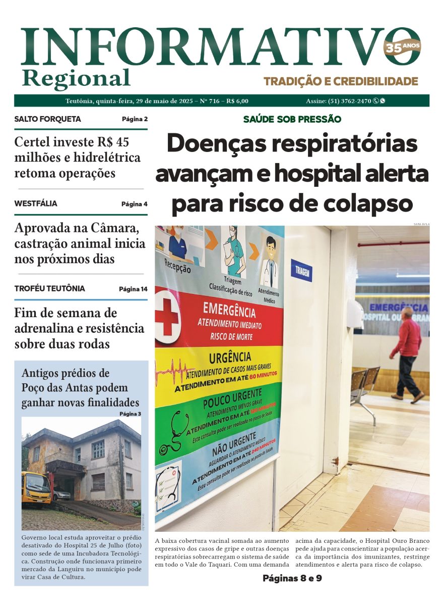 Ainda em maio, um surto de gripe influenza gerou preocupação entre as autoridades de saúde em todo o Rio Grande do Sul. Na microrregião, o Hospital Ouro Branco alertou para o risco de superlotação da estrutura hospitalar. A capa do dia 29 destacou o cenário epidemiológico e trouxe orientações à população sobre formas de prevenção.
