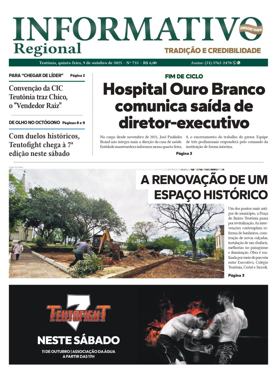 Conforme manchete da edição do dia 9 de outubro, o Hospital Ouro Branco anunciou a saída do diretor-executivo José Paulinho Brand. No cargo desde novembro de 2021, o gestor teve o contrato rompido. Segundo a associação mantenedora, o desligamento já estava previsto e foi antecipado de forma “estratégica”.