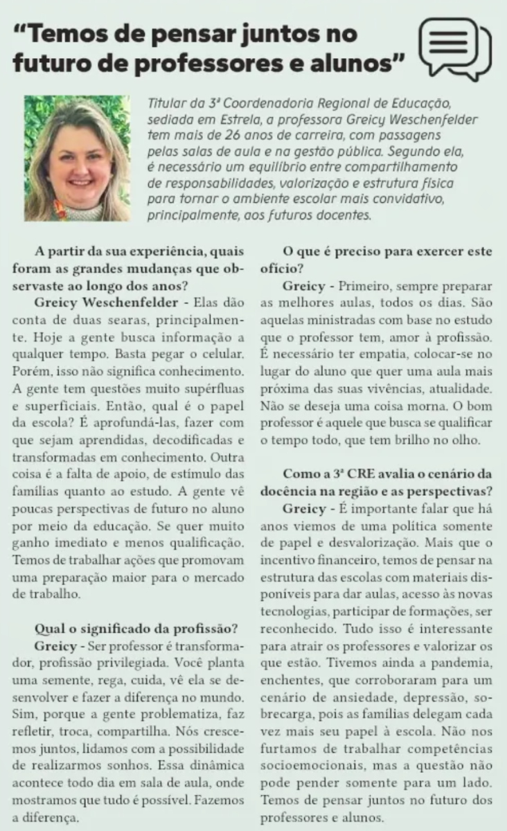 “Ser professor é ser capaz de mostrar formas de abrir horizontes, despertar uma luz e a motivação para lutar por algo melhor”, explana com orgulho. Entre outras curiosidades, o fato de já ter lecionado para uma avó, mãe e neta e em turmas com até 54 estudantes. Ainda, o reconhecimento de quem já foi seu aluno. Uma prova do trabalho bem feito.