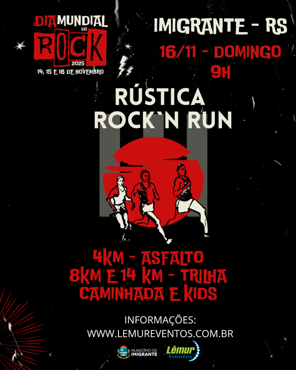 O município de Imigrante se prepara para sediar, no dia 16 de novembro, a 3ª edição da Rock’n Run, evento que combina esporte e música em uma experiência voltada a atletas, famílias e fãs do rock. A largada será no Ginásio Municipal, em uma programação que celebra o Dia Internacional do Rock and Roll.