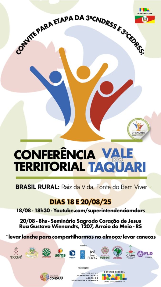 O Vale do Taquari receberá, nos dias 18 e 20 de agosto, a etapa regional da 3ª Conferência Nacional e da 3ª Conferência Estadual de Desenvolvimento Rural Sustentável e Solidário (CNDRSS e CEDRSS). Com o tema “Brasil Rural: Raiz da Vida, Fonte do Bem Viver”, o encontro busca reunir agricultores familiares e lideranças comunitárias para debater e construir propostas voltadas ao fortalecimento do campo.